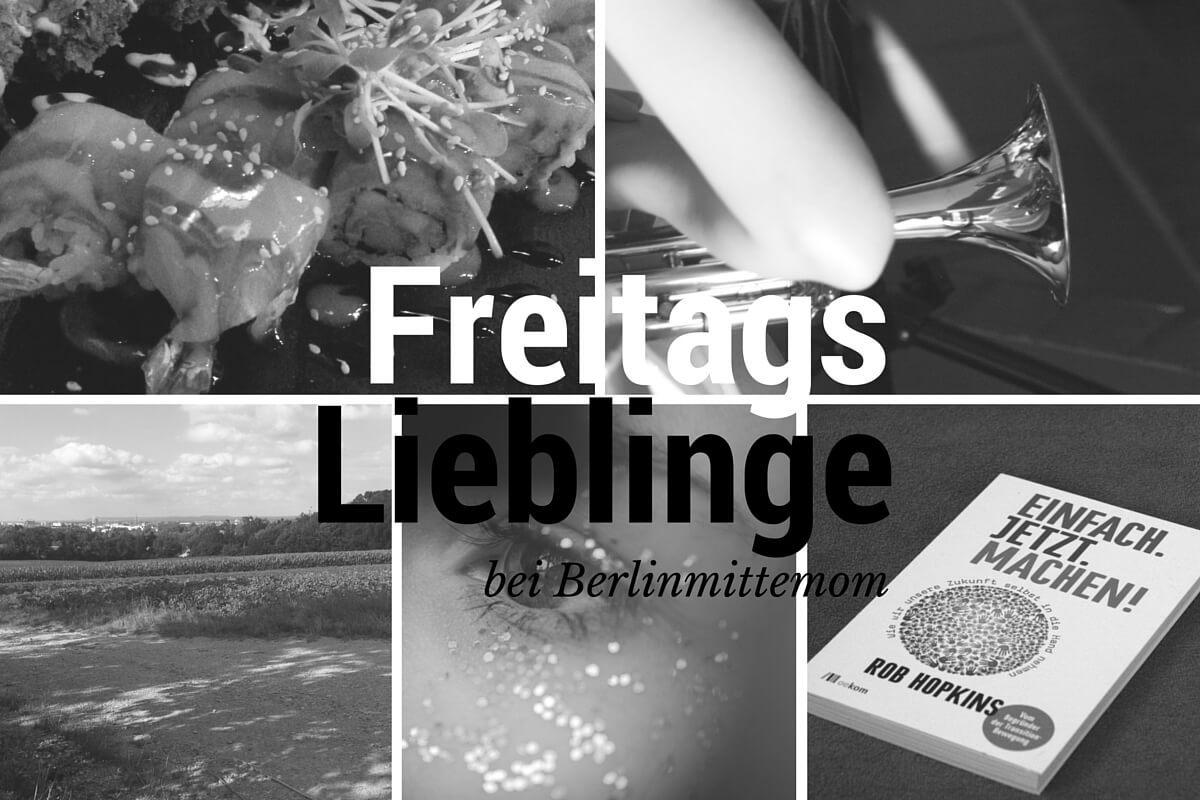 Lieblingsessen: Am Mittwoch war ich mit einer Freundin Sushi essen. Sie hatte Geburtstag und wir verbrachten zusammen einen wunderbaren Abend. Ich liebe gutes Sushi, und das hier war richtig lecker.Liebkingsbuch: Mein Traum ist es, unseren Kindern eine Welt zu übergeben, die lebenswert ist. Rob Hobkins und seine Transition Theorie klingt spannend.In seinem Buch Einfach. Jetzt Machen! schreibt er über seine Vision durch lokales Handeln die Welt zu verändern. Für eine Welt, in der Beziehungen und Koperationen mehr zählen als Konsum und Konkurrenz. Ein weiter weg, aber fangen wir mal an.Lieblingsmoment mit den Kindern: Auch diese Woche gab es wieder eine Aufführung von einem der Kinder: die große spielte Trompete und verzauberte alle. Ich wundere mich immer wieder, wiemit so wenig Übung so viel tolles aus dem Holzblasinstrument herauskommen kann. Gemeinsam hörten wir zu und gemeinsam gönnten wir uns danach noch ein Eis.Lieblingsmoment: In dieser Woche war alles so hektisch und irgendwie fühlte ich mich wie von einem vorbeifahrenden Zug mitgerissen. Wenn es gerade ganz schlimm ist, schnappe ich mir den Hund und gehe mit ihm ein paar Schritte. Oder renne. Das tut mir gut um den Kopf frei zu bekommen.Lieblingsinspiration: Der Artikel Ungeschminkt von Svenja, in dem sie zu Alicia Keys Open Letter zum Thema #nomakeup schreibt: